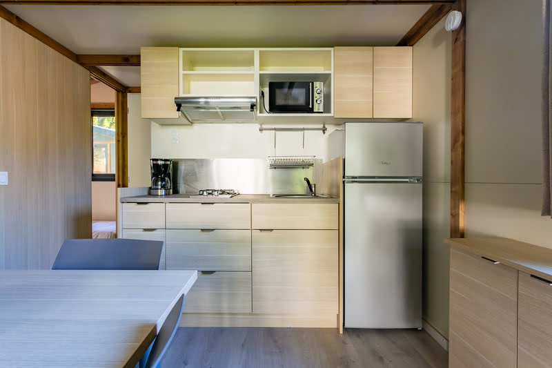 Coin salon/séjour : cuisine équipée (évier, feux gaz, réfrigérateur/congélateur, cafetière à filtre, micro-ondes, vaisselle), radiateur dans le séjour, TV.
