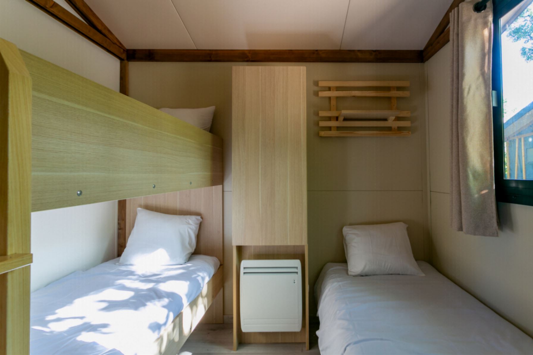 Coin nuit : une chambre avec 1 lit double (140×190), une chambre avec 3 lits (80×190) côte à côte et/ou superposés, oreillers et couettes fournis.