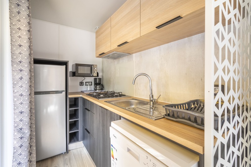 Coin salon/séjour : cuisine équipée (évier, plaques gaz, réfrigérateur/congélateur, cafetière Senseo et/ou à filtre, micro-ondes, vaisselle, lave-vaisselle), radiateur dans le séjour, climatisation et TV.