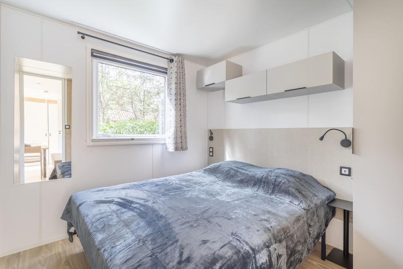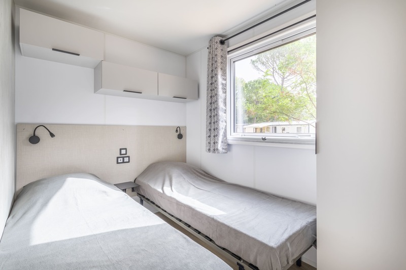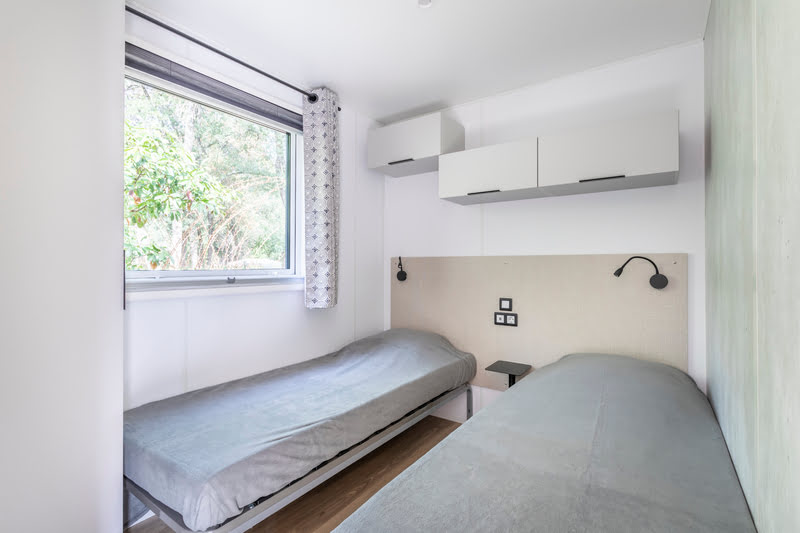 Coin nuit : une chambre avec 1 lit double (160×200), deux chambres avec 2 lits simples (90×190) côte à côte, oreillers et couettes fournis.