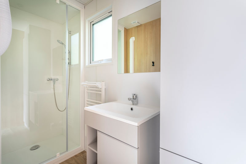 Sanitaire : salle d’eau avec douche, lavabo, et WC séparés.